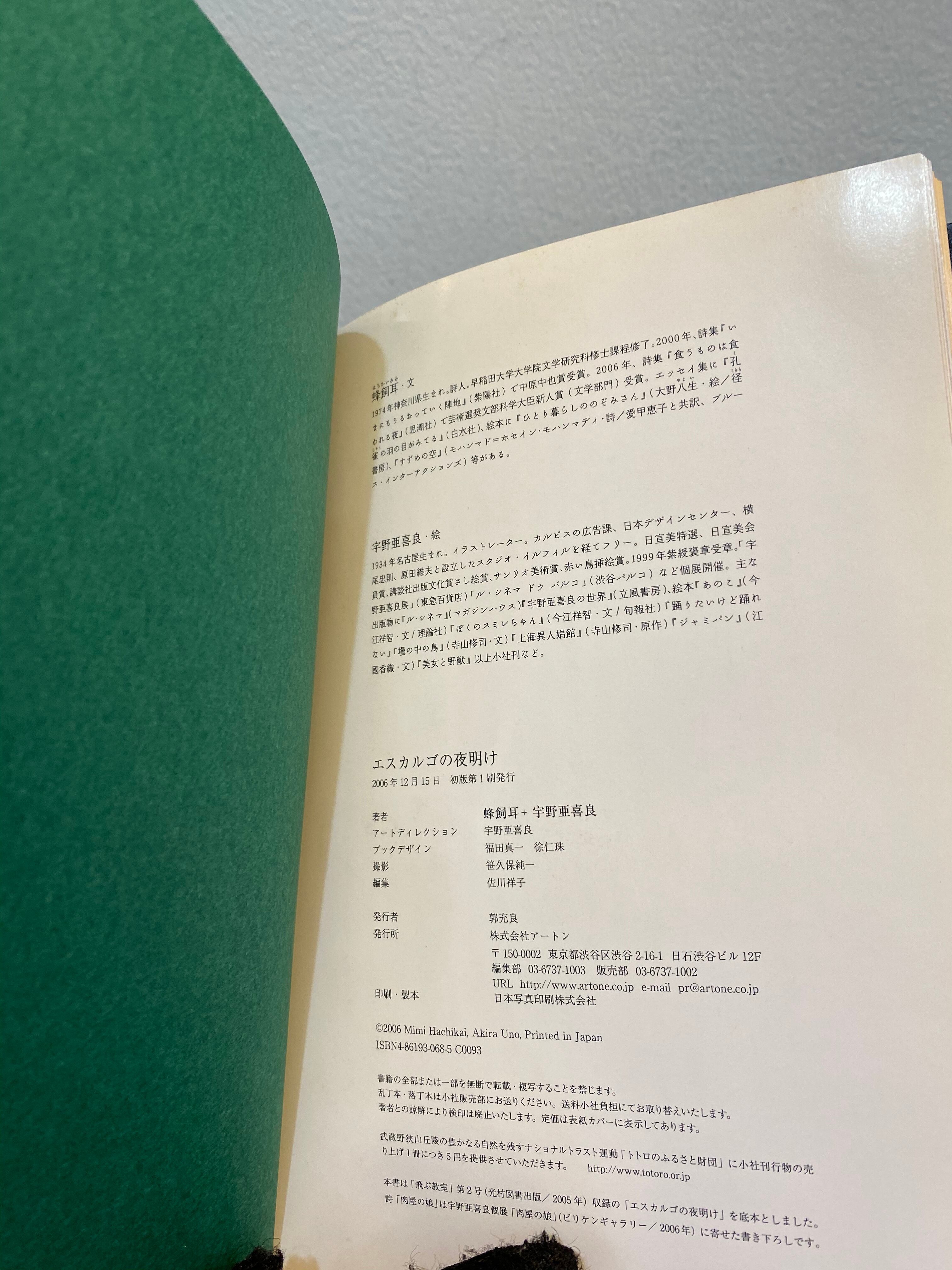 エスカルゴの夜明け 蜂飼耳 文 宇野亜喜良 絵 2006年 アートン発行 初版 小判ハードカバー 表紙、裏表紙、小口上部にサケ 扉に献呈とサイン入り